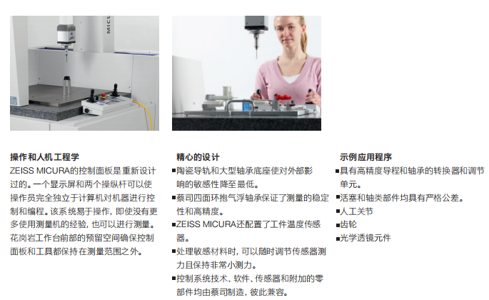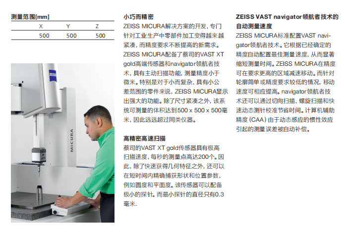 工業(yè)生產(chǎn)中的零部件日趨小型化,同時(shí)對(duì)測(cè)量精度的要求也在不斷提高,MICURA正是針對(duì)這一全新需求定制的解決方案。MICURA采用蔡司VAST XT gold掃描探頭與navigator技術(shù), 可在主動(dòng)式掃描時(shí)獲得微米級(jí)的測(cè)量精度。它尤其適于測(cè)量用于光學(xué)和電子產(chǎn)品的結(jié)構(gòu)復(fù)雜的小型工件。盡管采用緊湊型設(shè)計(jì),系統(tǒng)卻具備500 x 500 x 500毫米的測(cè)量能力——性能遠(yuǎn)超同類產(chǎn)品。